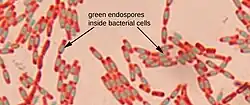 Endospore staining is a technique used in bacteriology to identify the presence of endospores in a bacterial sample.[1] Within bacteria, endospores are protective structures used to survive extreme conditions, including high temperatures making them highly resistant to chemicals.[2] Endospores contain little or no ATP which indicates how dormant they can be. Endospores contain a tough outer coating made up of keratin which protects them from nucleic DNA as well as other adaptations. Endospores are able to regerminate into vegetative cells, which provides a protective nature that makes them difficult to stain using normal techniques such as simple staining and gram staining. Special techniques for endospore staining include the Schaeffer–Fulton stain and the Moeller stain.