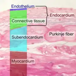 Microscopic view showing endothelium (at top) inside the heart.