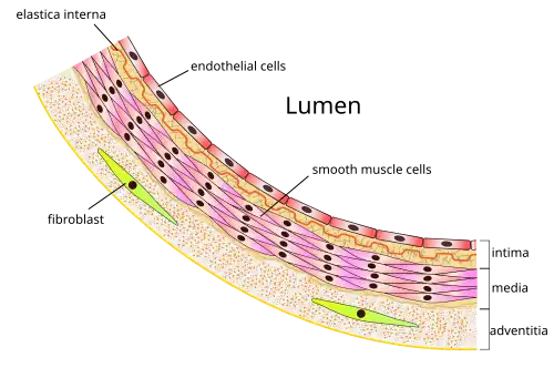 Endothelial dysfunction is a result of changes in endothelial function.[22][23] After fat (lipid) accumulation and when stimulated by inflammation, endothelial cells become activated, which is characterized by the expression of molecules such as E-selectin, VCAM-1 and ICAM-1, which stimulate the adhesion of immune cells.[24] Additionally, transcription factors, which are substances which act to increase the production of proteins within cells, become activated; specifically AP-1 and NF-κB, leading to increased expression of cytokines such as IL-1, TNFα and IFNγ, which promotes inflammation.[25][26] This state of endothelial cells promotes accumulation of lipids and lipoproteins in the intima, leading to atherosclerosis, and the subsequent recruitment of white blood cells and platelets, as well as proliferation of smooth muscle cells, leading to the formation of a fatty streak. The lesions formed in the intima, and persistent inflammation lead to desquamation of endothelium, which disrupts the endothelial barrier, leading to injury and consequent dysfunction.[27] In contrast, inflammatory stimuli also activate NF-κB-induced expression of the deubiquitinase A20 (TNFAIP3), which has been shown to intrinsically repair the endothelial barrier.[28]