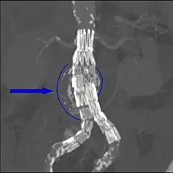 Abdominal aortic endograft on a CT scan; original aneurysm marked in blue