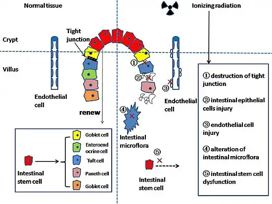 23. 23.0 23.1 Hauer-Jensen, Martin; Denham, James W.; Andreyev, H. Jervoise N. (2016-10-14). "Radiation Enteropathy – Pathogenesis, Treatment, and Prevention". Nature Reviews. Gastroenterology & Hepatology. 11 (8): 470–479. doi:10.1038/nrgastro.2014.46. ISSN 1759-5045. PMC 4346191. PMID 24686268.