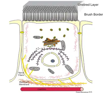 Schematic drawing of an enterocyte: the intestinal lumen is above the brush border.