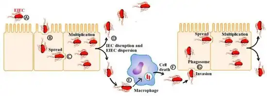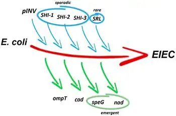 - ↑ 1.0 1.1 Pasqua, Martina; Michelacci, Valeria; Di Martino, Maria Letizia; Tozzoli, Rosangela; Grossi, Milena; Colonna, Bianca; Morabito, Stefano; Prosseda, Gianni (2017). "The Intriguing Evolutionary Journey of Enteroinvasive E. coli (EIEC) toward Pathogenicity". Frontiers in Microbiology. 8: 2390. doi:10.3389/fmicb.2017.02390. ISSN 1664-302X. Archived from the original on 2023-01-19. Retrieved 2023-04-24.