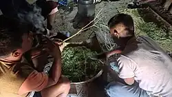 Rapé is a ceremonial snuff primarily made from Nicotiana rustica (mapacho), often blended with alkaline ashes to enhance nasal absorption. It is used by numerous Amazonian peoples.[32] The ashes derive from trees such as Theobroma, Cecropia, or murití; their inclusion alkalinizes the mixture and potentiates the tobacco's effects. Administration is typically performed by a shaman or specialist who blows the powder into the recipient's nostrils, although it can also be self-administered using short tubes.[33][34]