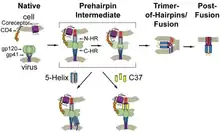 - ↑ Xiao, Tianshu; Cai, Yongfei; Chen, Bing (2021). "HIV-1 entry and membrane fusion inhibitors". Viruses. 13 (5): 735. doi:10.3390/v13050735. PMC 8146413. PMID 33922579.