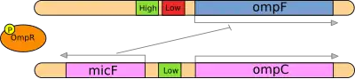 - ↑ Aiba, H; Mizuno, T (12 February 1990). "Phosphorylation of a bacterial activator protein, OmpR, by a protein kinase, EnvZ, stimulates the transcription of the ompF and ompC genes in Escherichia coli". FEBS Letters. 261 (1): 19–22. Bibcode:1990FEBSL.261...19A. doi:10.1016/0014-5793(90)80626-t. PMID 2407554.