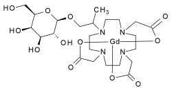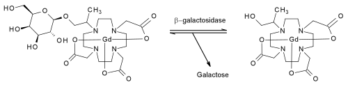 Two distinct β-galactosidase-activated contrast agents have been reported. Both consist of a Gd(III) ion complexed with a tetraazamacrocycle. At the N-10 position, a two-carbon chain links the gadolinium-tertaazamacrocycle complex to a molecule of galactose. The galactose is linked to the complex by a β-glycosidic bond at its C-1 position.[4]
