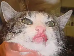 The lesions mostly appear on the upper lip as ulcers, but they also develop on the gums and palate. Other locations like foot pads are not exceptional and are typical for developing plaques instead of ulcers.[9] Such plaques may be itchy and swelling. In the case of oral ulceration, bleeding, pain and loss of appetite may be present.[10]