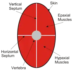 In adult vertebrates, trunk muscles can be broadly divided into hypaxial muscles, which lie ventral to the horizontal septum of the vertebrae and epaxial muscles, which lie dorsal to the septum.[1] Hypaxial muscles include some vertebral muscles, the diaphragm, the abdominal muscles, and all limb muscles. The serratus posterior inferior and serratus posterior superior are innervated by the ventral primary ramus and are hypaxial muscles. Epaxial muscles include other (dorsal) muscles associated with the vertebrae, ribs, and base of the skull. In humans, the erector spinae, the transversospinales (including the multifidus, semispinalis and rotatores), the splenius and suboccipital muscles are the only epaxial muscles.