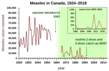 In 2011, Quebec experienced the largest outbreak of measles in the Americas since 2002.[38] The outbreak began on 8 January with unvaccinated individuals acquiring the disease whilst traveling to France, a country with high measles incidence, and returning home to Quebec.[39] Public health officials responded to the outbreak by launching a mass vaccination campaign,[40] and on 22 December, the outbreak ended with a total of 776 cases having occurred. 615 cases (79%) had not been vaccinated, including 29 infants too young to receive the vaccine. 11% of cases required hospitalization, and complications occurred in 64 cases (8%), with pneumonia being the most common complication observed (3% of cases). No deaths were reported.[38]
