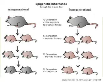 The inheritance of epigenetic marks in the immediate generation is referred to as intergenerational inheritance.[3] In male mice, the epigenetic signal is maintained through the F1 generation.[4] In female mice, the epigenetic signal is maintained through the F2 generation as a result of the exposure of the germline in the womb.[4] Many epigenetic signals are lost beyond the F2/F3 generation and are no longer inherited, because the subsequent generations were not exposed to the same environment as the parental generations.[3] The signals that are maintained beyond the F2/F3 generation are referred to as transgenerational epigenetic inheritance (TEI), because initial environmental stimuli resulted in inheritance of epigenetic modifications.[5] There are several mechanisms of TEI that have shown to affect germline reprogramming, such as transgenerational increases in susceptibility to diseases, mutations, and stress inheritance. During germline reprogramming and early embryogenesis in mice, methylation marks are removed to allow for development to commence, but the methylation mark is converted into hydroxymethyl-cytosine so that it is recognized and methylated once that area of the genome is no longer being used,[6] which serves as a memory for that TEI mark. Therefore, under lab conditions, inherited methyl marks are removed and restored to ensure TEI still occurs. However, observing TEI in wild populations is still in its infancy, as laboratory studies allow for more tractable systems.[7]