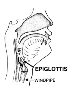 During swallowing, the epiglottis bends backwards, folding over the entrance to the trachea, and preventing food from going into it.[2] The folding backwards is a complex movement the causes of which are not completely understood.[2] It is likely that during swallowing the hyoid bone and the larynx move upward and forward, which increases passive pressure from the back of the tongue; the aryepiglottic muscles contract; the passive weight of the food pushes down; and the laryngeal and thyroarytenoid muscles contract.[2] The consequence of this is that during swallowing the bent epiglottis blocks off the trachea, preventing food from going into it; food instead travels down the esophagus, which is behind it.[3]
