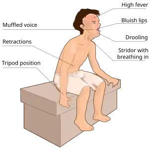 Epiglottitis is inflammation of the epiglottis—the flap at the base of the tongue that prevents food entering the trachea (windpipe).[7] Symptoms are usually rapid in onset and include trouble swallowing which can result in drooling, changes to the voice, fever, and an increased breathing rate.[1][2] As the epiglottis is in the upper airway, swelling can interfere with breathing.[7] People may lean forward in an effort to open the airway.[1] As the condition worsens stridor and bluish skin may occur.[1]