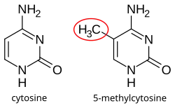 DNA methylation often occurs in repeated sequences, and helps to suppress the expression and movement of 'transposable elements':[37] Because 5-methylcytosine can spontaneously deaminate to thymidine(replacing nitrogen by oxygen), CpG sites are frequently mutated and have become rare in the genome, except at CpG islands where they typically remain unmethylated. Epigenetic changes of this type thus have the potential to direct increased frequencies of permanent genetic mutation. DNA methylation patterns are known to be established and modified in response to environmental factors by a complex interplay of at least three independent DNA methyltransferases, DNMT1, DNMT3A, and DNMT3B, the loss of any of which is lethal in mice.[38] DNMT1 is the most abundant methyltransferase in somatic cells,[39] localizes to replication foci,[40] has a 10–40-fold preference for hemimethylated DNA and interacts with the proliferating cell nuclear antigen (PCNA).[41]
