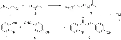 The condensation between 2'-Fluoroacetophenone [445-27-2] (5) & 4-hydroxybenzaldehyde [123-08-0] (6) give a chalcone intermediate (also an enone), i.e. CID:53982926 (7).