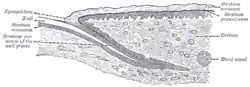 In human anatomy, the eponychium is the thickened layer of skin at the base of the fingernails and toenails.[1] It can also be called the medial or proximal nail fold. Its function is to protect the area between the nail and epidermis from exposure to bacteria. The vascularization pattern is similar to that of perionychium.[2] The eponychium differs from the cuticle – the eponychium is made up of live skin cells whilst the cuticle is dead skin cells.