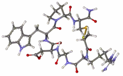 Eptifibatide (Integrilin, Millennium Pharmaceuticals, also co-promoted by Schering-Plough/Essex), is an antiplatelet drug of the glycoprotein IIb/IIIa inhibitor class.[1] Eptifibatide is a cyclic heptapeptide derived from a disintegrin protein (P22827) found in the venom of the southeastern pygmy rattlesnake (Sistrurus miliarius barbouri). It belongs to the class of the arginine-glycine-aspartate-mimetics and reversibly binds to platelets. Eptifibatide has a short half-life. The drug is the third inhibitor of GPIIb/IIIa that has found broad acceptance after the specific antibody abciximab and the non-peptide tirofiban entered the global market.