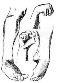 Ergotism, also known as ergot poisoning, are toxic effects due to long-term exposure to ergot (a fungus).[6][5] It presents in two ways: as burning pain, numbness, bluish discoloration, and gangrene of the hands and feet; or as hallucinations, paranoia, double vision, and muscle spasms.[2][1][6] The first type progresses over weeks; while vitamin A in dairy products may protects against the later.[1] Generally the gangrenous type occurred West of the Rhine river and the convulsive type East, though there is disagreement on this.[6][3]
