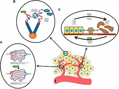 Eribulin is a mechanistically unique inhibitor of microtubule dynamics,[23][24] binding predominantly to a small number of high affinity sites at the plus ends of existing microtubules.[25][26] Eribulin has both cytotoxic and non-cytotoxic mechanisms of action. Its cytotoxic effects are related to its antimitotic activities, wherein apoptosis of cancer cells is induced following prolonged and irreversible mitotic blockade.[27][28] In addition to its cytotoxic, antimitotic-based mechanisms, preclinical studies in human breast cancer models have shown that eribulin also exerts complex effects on the biology of surviving cancer cells and residual tumors that appear unrelated to its antimitotic effects. These non-mitotic mechanisms include vascular remodeling that leads to increased tumor perfusion and mitigation of tumor hypoxia, phenotypic changes consistent with reversal of epithelial-mesenchymal transition (EMT), and decreased capacity for migration and invasion leading to reduced metastatic capacity as measured in a preclinical experimental metastasis model.[29][30] In other studies, eribulin treatment of leiomyosarcoma and liposarcoma cells leads to increased expression of smooth muscle and adipocyte differentiation antigens, respectively.[31] Taxane-resistant cancers are often unresponsive to eribulin. A recent study found that this resistance is due to expression of multidrug resistance protein 1 (MDR1).[32] Fluorescently labeled eribulin has been used to study the pharmacokinetics and pharmacodynamics at single cell level in vivo.[32]