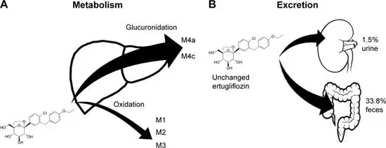 After oral intake, ertugliflozin is practically completely absorbed from the gut and undergoes no relevant first-pass effect. Highest blood plasma concentrations are reached after one hour. When in circulation, 93.6% of the substance are bound to plasma proteins. Ertugliflocin is metabolised mainly to glucuronides by the enzymes UGT1A9 and UGT2B7. Cytochrome P450 enzymes play only a minor role in its metabolism.[1][12]