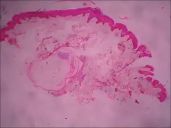 Histopathology is the basis of diagnosis. Stratified-squamous epithelium with a granular layer that surrounding a cystic space filled with laminated keratin and a variable number of vellus hair cysts is seen to be present.[4] It can be difficult to distinguish from other skin conditions, including molluscum contagiosum and acne vulgaris but can be corroborated with histopathology.[6]