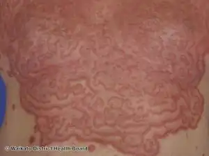 | Symptoms | Expanding swirly wavy red lines, scale, itch[1] |
