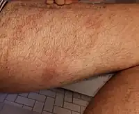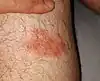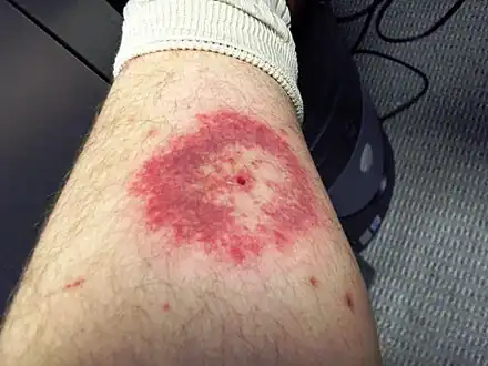 Erythema migrans or erythema chronicum migrans is an expanding rash often seen in the early stage of Lyme disease, and can also (but less commonly) be caused by southern tick-associated rash illness (STARI).[1][2] It can appear anywhere from one day to one month after a tick bite. This rash does not represent an allergic reaction to the bite, but rather an actual skin infection of one of the Lyme bacteria species from the genus Borrelia. The rash's name comes from Neo-Latin for "migrating redness."