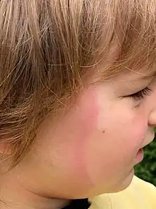 The initial sign of about 80% of Lyme infections is an erythema migrans (EM) rash at the site of a tick bite, often near skin folds, such as the armpit, groin, or back of knee, on the trunk, under clothing straps, or in children's hair, ear, or neck.[3][10] Most people who get infected do not remember seeing a tick or the bite. The EM rash appears typically one or two weeks (range 3–32 days) after the bite. The most distinctive features of the EM rash are the speed and extent to which it expands, respectively 2–3 cm per day and up to a diameter of 5–70 cm (50% attain more than 16 cm).[3][10][4] The rash is usually circular or oval, red or bluish, and may have an elevated or darker center.[10][5] In about 79% of cases in Europe but only 19% of cases in endemic areas of the U.S., the rash gradually clears from the center toward the edges, possibly forming a "bull's eye" pattern.[4][5] The rash may feel warm but usually is not itchy, is rarely tender or painful, and takes up to four weeks to resolve if untreated.[10][12][13]