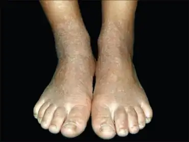 One type is characterized by generalized, persistent, brown hyperkeratosis with accentuated skin markings, while a second type is localized, with involvement that is limited in extent and characterized by sharply demarcated, hyperkeratotic plaques.[2][6]: 565