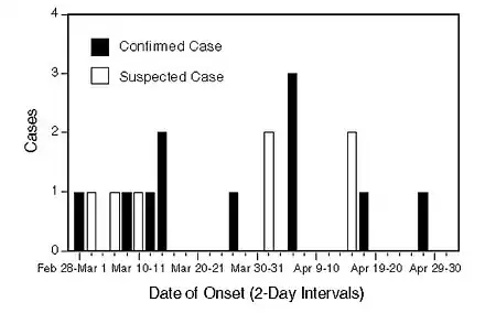 - ↑ "Outbreak of acute gastroenteritis attributable to Escherichia coli serotype O104:H21--Helena, Montana, 1994". MMWR. Morbidity and mortality weekly report. 44 (27): 501–503. 14 July 1995. ISSN 0149-2195.