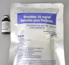 Esmolol, sold under the brand name Brevibloc among others, is a medication used to treat supraventricular arrhythmias, high blood pressure, and myocardial ischemia.[1] It is given by injection into a vein.[1] Onset of effects can begin within a minute and last for up to 30 minutes.[1]