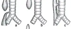 | Common anatomical types of esophageal atresia a) Esophageal atresia with distal tracheoesophageal fistula (86%), Gross C. b) Isolated esophageal atresia without tracheoesophageal fistula (7%), Gross A. c) H-type tracheoesophageal fistula (4%), Gross E.[1] | |