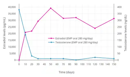 The side effects of EMP overall have been described as relatively severe.[6] The most common side effects of EMP have been reported to be gastrointestinal side effects like nausea, vomiting, and diarrhea, with nausea and vomiting occurring in 40% of men.[23][4] They are usually mild or moderate in severity, and the nausea and vomiting can be managed with prophylactic antiemetic medications.[23] Nonetheless, severe cases of gastrointestinal side effects with EMP may require dose reduction or discontinuation of therapy.[4] Although nausea and vomiting have been reported to be the most common side effects of EMP, gynecomastia (male breast development) has been found to occur in as many as 83% of men treated with EMP, and the incidence of erectile dysfunction is possibly similar to or slightly less than the risk of gynecomastia.[6] As a rule, feminization, a gynoid fat distribution, demasculinization, and impotence are said to occur in virtually or nearly 100% of men treated with high-dose estrogen therapy.[24][25] Decreased sexual activity has also been reported in men treated with EMP.[4] These side effects are due to high estrogen levels and low testosterone levels.[4][6] Prophylactic irradiation of the breasts can be used to decrease the incidence and severity of gynecomastia with estrogens.[24]