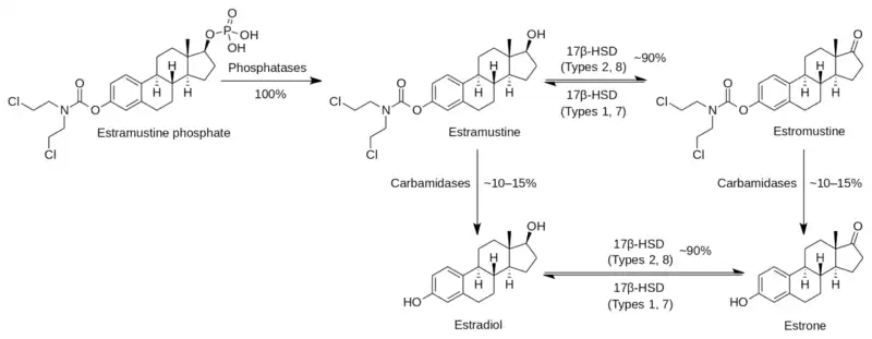 - ↑ Gunnarsson O, Andersson SB, Johansson SA (1983). "The hydrolysis of estramustine phosphate; in vitro studies". Eur J Drug Metab Pharmacokinet. 8 (4): 395–402. doi:10.1007/BF03188772. PMID 6673977. S2CID 22105700.