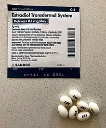 An estrogen patch, or oestrogen patch, is a transdermal delivery system for estrogens such as estradiol and ethinylestradiol which can be used in menopausal hormone therapy, feminizing hormone therapy for transgender women, hormonal birth control, and other uses.[1] Transdermal preparations of estrogen are metabolized differently than oral preparations. Transdermal estrogens avoid the first pass through the liver and thus potentially reduce the risk of blood clotting and stroke.[2]