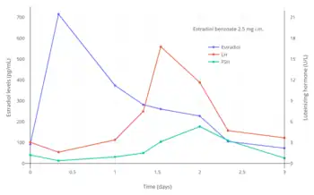 The estrogen provocation test, also known as the estrogen stimulation test or estrogen challenge test, is a diagnostic procedure used to evaluate the function of the hypothalamic–pituitary–gonadal axis.[2][3][4] It involves the administration of a large amount of estrogen, resulting in estrogenic exposure similar to or greater than normal preovulatory estradiol levels, in an attempt to induce a positive feedback surge in levels of the gonadotropins, luteinizing hormone (LH) and follicle-stimulating hormone (FSH).[2][3] Estrogens that have been used in the estrogen provocation test include estradiol benzoate, estradiol valerate, ethinylestradiol, and high-dose transdermal estradiol patches.[2][3][4][5] The test involves sustained estrogenic exposure equivalent to estradiol levels of 200 to 300 pg/mL or more for at least 50 hours[6] and results in a surge in gonadotropin levels about 32 to 72 hours following initiation of estrogenic exposure.[7][5] Levels of LH and FSH increase during the gonadotropin surge by about 10-fold and 4-fold, respectively.[5]