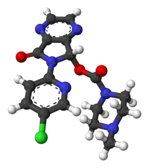 Eszopiclone acts on benzodiazepine binding site situated on GABAA neurons as a positive allosteric modulator.[25] Eszopiclone is rapidly absorbed after oral administration, with serum levels peaking between .45 and 1.3 hours.[26][5] The elimination half-life of eszopiclone is approximately 6 hours and it is extensively metabolized by oxidation and demethylation. Approximately 52% to 59% of a dose is weakly bound to plasma protein. Cytochrome P450 (CYP) isozymes CYP3A4 and CYP2E1 are involved in the biotransformation of eszopiclone; thus, drugs that induce or inhibit these CYP isozymes may affect the metabolism of eszopiclone. Less than 10% of the orally administered dose is excreted in the urine as racemic zopiclone.[27] In terms of benzodiazepine receptor binding and relevant potency, 3 mg of eszopiclone is equivalent to 10 mg of diazepam.[28]