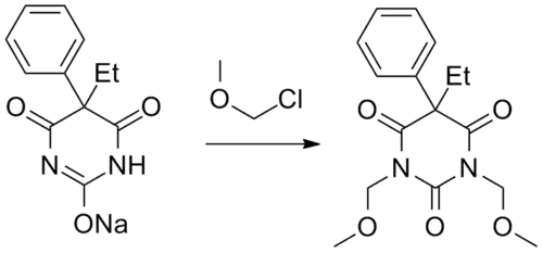 - ↑ Vida JA, Wilber WR, Reinhard JF (March 1971). "Anticonvulsants. 2. Acyloxymethyl and halomethyl derivatives of barbituric acid and diphenylhydantoin". Journal of Medicinal Chemistry. 14 (3): 187–9. doi:10.1021/jm00285a002. PMID 5552206.