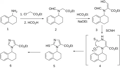 2-Aminotetralin () is alkylated with ethyl chloroacetate to afford the glycine derivative. Heating with formic acid then affords the amide (2). This compound is then reacted with ethyl formate to yield hydroxymethylene ester (3). Reaction with isothiocyanic acid gives the imidazole-2-thiol (5). The sequence may first involve hydrolysis of the formamido group, followed by addition of the amine to isothiocyanic acid; cyclization of the thiourea nitrogen with the formyl function would complete formation of the heterocycle. Desulfurization by means of Raney nickel finishes the synthesis of ethonam (6).