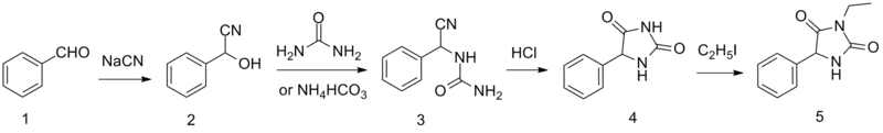 Ethotoin is synthesized by the reaction of benzaldehyde oxynitrile (2) with urea or ammonium bicarbonate, which forms an intermediate urea derivative (3) which on acidic conditions cyclizes to 5-phenylhydantoin (4).[5] Alkylation of this product using ethyl iodide leads to the formation of ethotoin (5).