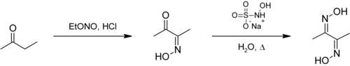- ↑ Semon, W. L.; Damerell, V. R. (1943). "Dimethylglyoxime". Organic Syntheses; Collected Volumes, vol. 2, p. 204.