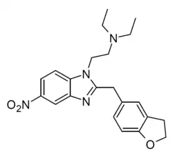 Ethyleneoxynitazene (Tetrahydrofuranitazene) is a benzimidazole derivative which has been sold as a designer drug over the internet and has opioid effects, though with lower potency than etonitazene itself[1] It is an analogue of etonitazene where the 4-ethoxy group attached to the benzyl ring has been cyclised round to the 3-position to form a 2,3-dihydrobenzofuran ring system. It was first reported in Estonia in February 2023,[2] subsequently in the UK in late 2023[3] and in China July 1st.[4]