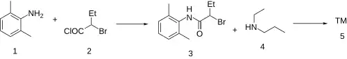 The amide reaction between 2,6-xylidine (1) and 2-bromobutyryl chloride [22118-12-3] (2) gives 2-Bromo-N-(2,6-Dimethylphenyl)Butanamide [53984-81-9] (3). Alkylation with N-Ethylpropylamine [20193-20-8] (4) gives Etidocaine (5).
