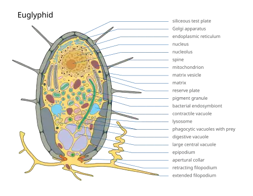The euglyphids are a prominent group of filose amoebae that produce shells or tests that in most described species is reinforced by siliceous scales, plates, and sometimes spines, but this reinforcement is absent in other species.[2]