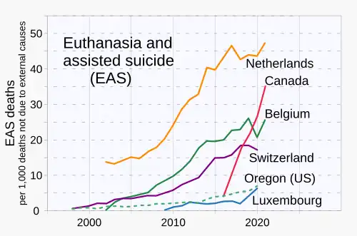 Rates of euthanasia and assisted suicide (EAS) have increased substantially in developed countries, with wide variance in the rates of increase.[62]