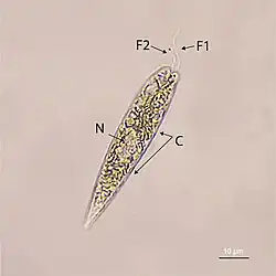 Members of the family Eutreptiaceae are unicellular flagellates, microscopic eukaryotes or protists capable of swimming by using flagella. Each individual has two or four heterodynamic flagella, of equal or unequal length, emerging from a pocket in the anterior side of the cell. The cells are usually capable of extensive flexibility or metaboly, a characteristic of all spirocute euglenids. Every species of this family is phototrophic and found primarily in marine or brackish habitats, rarely in freshwater ecosystems.[4]