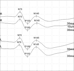 The P100 component of VEP response, which is the positive peak with the delay about 100 ms, has a major clinical importance. The visual pathway dysfunction anterior to the optic chiasm maybe where VEPs are most useful. For example, patients with acute severe optic neuritis often lose the P100 response or have highly attenuated responses. Clinical recovery and visual improvement come with P100 restoration but with an abnormal increased latency that continues indefinitely, and hence, it maybe useful as an indicator of previous or subclinical optic neuritis.[31]