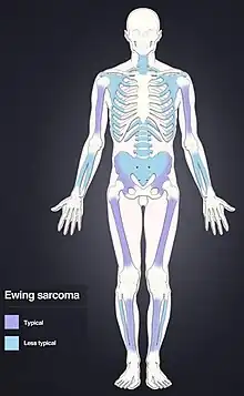 Ewing sarcoma (EwS) is a type of cancer that can form in bone or in soft tissue.[1] Symptoms may include swelling and pain at the site of the tumor, fever, or a bone fracture.[3] The most common areas affected are the shafts of long bones of the legs, the pelvis, and the chest wall.[5] In soft tissue, it can affect various parts of the body.[6] In about 25% of cases, the cancer has already spread to other parts of the body at the time of diagnosis.[7]