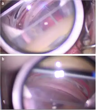 ![]() Gonioscopic view of excimer laser trabeculostomy. View of the probe contacting the trabecular meshwork (a) and the subsequent trabeculostomy openings with bubble formation (b). | |