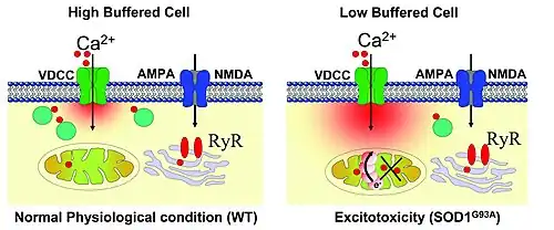 In excitotoxicity, nerve cells suffer damage or death when the levels of otherwise necessary and safe neurotransmitters such as glutamate become pathologically high, resulting in excessive stimulation of receptors.[2] For example, when glutamate receptors such as NMDA receptors or AMPA receptors encounter excessive levels of the excitatory neurotransmitter, glutamate, significant neuronal damage might ensue. Different mechanisms might lead to increased extracellular glutamate concentrations, e.g. reduced uptake by glutamate transporters (EAATs), synaptic hyperactivity, or abnormal release from different neural cell types.[3][4] Excess glutamate allows high levels of calcium ions (Ca2+) to enter the cell. Ca2+ influx into cells activates a number of enzymes, including phospholipases, endonucleases, and proteases such as calpain. These enzymes go on to damage cell structures such as components of the cytoskeleton, membrane, and DNA.[1][5] In evolved, complex adaptive systems such as biological life it must be understood that mechanisms are rarely, if ever, simplistically direct. For example, NMDA, in subtoxic amounts, can block glutamate toxicity and induce neuronal survival.[6][7] In addition to abnormally high neurotransmitter concentrations, also elevation of the extracellular potassium concentration, acidification and other mechanisms may contribute to excitotoxicity.